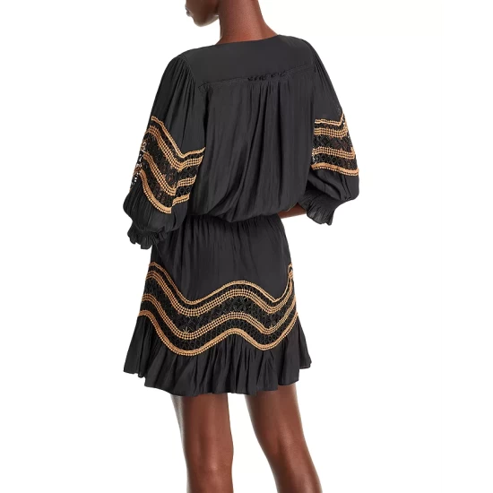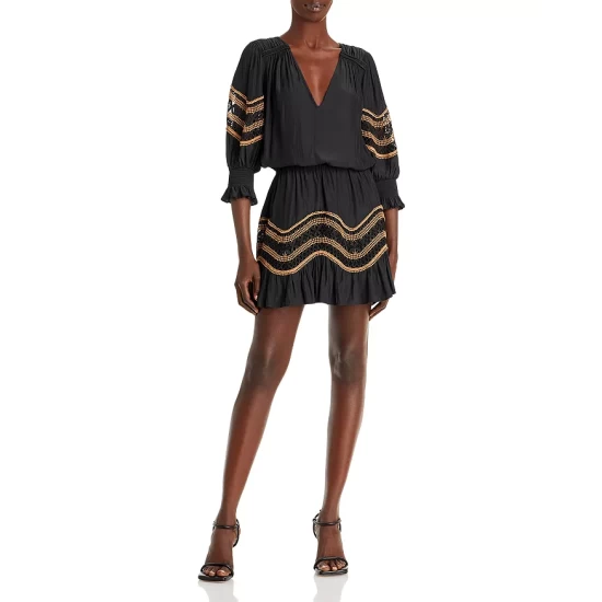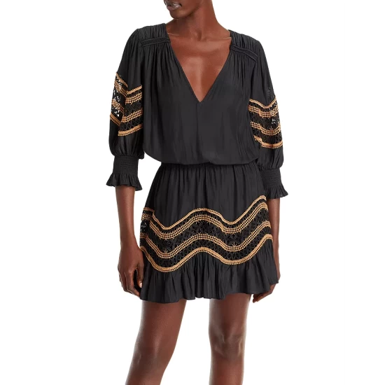 - Elbow length sleeves with smocked ruffled trim cuffs